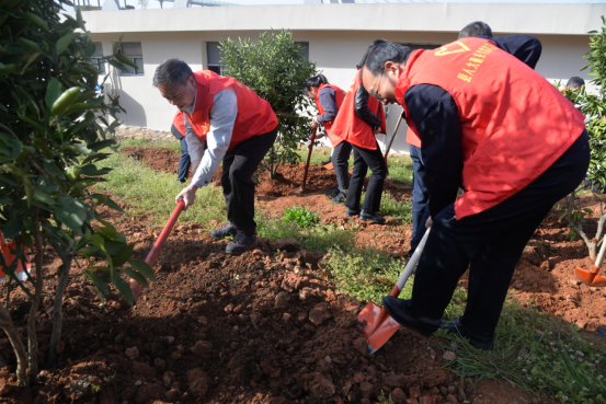 植树现场,大家干劲十足,撸起袖子,拿起铁锹铁铲,挥锹铲土、放树入坑、扶正填坑、踩土定植,分工明确、配合默契。
