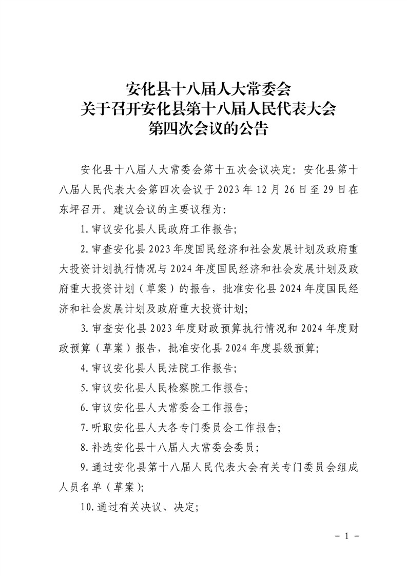 关于召开安化县第十八届人民代表大会第四次会议的公告