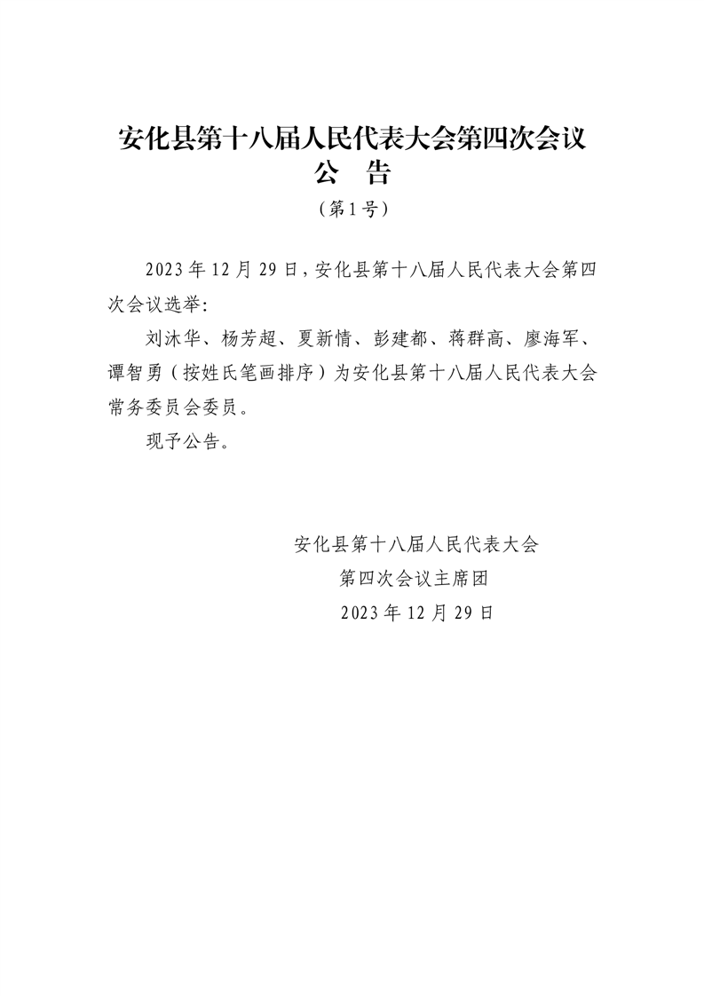 安化县第十八届人民代表大会第四次会议公告(第1号)