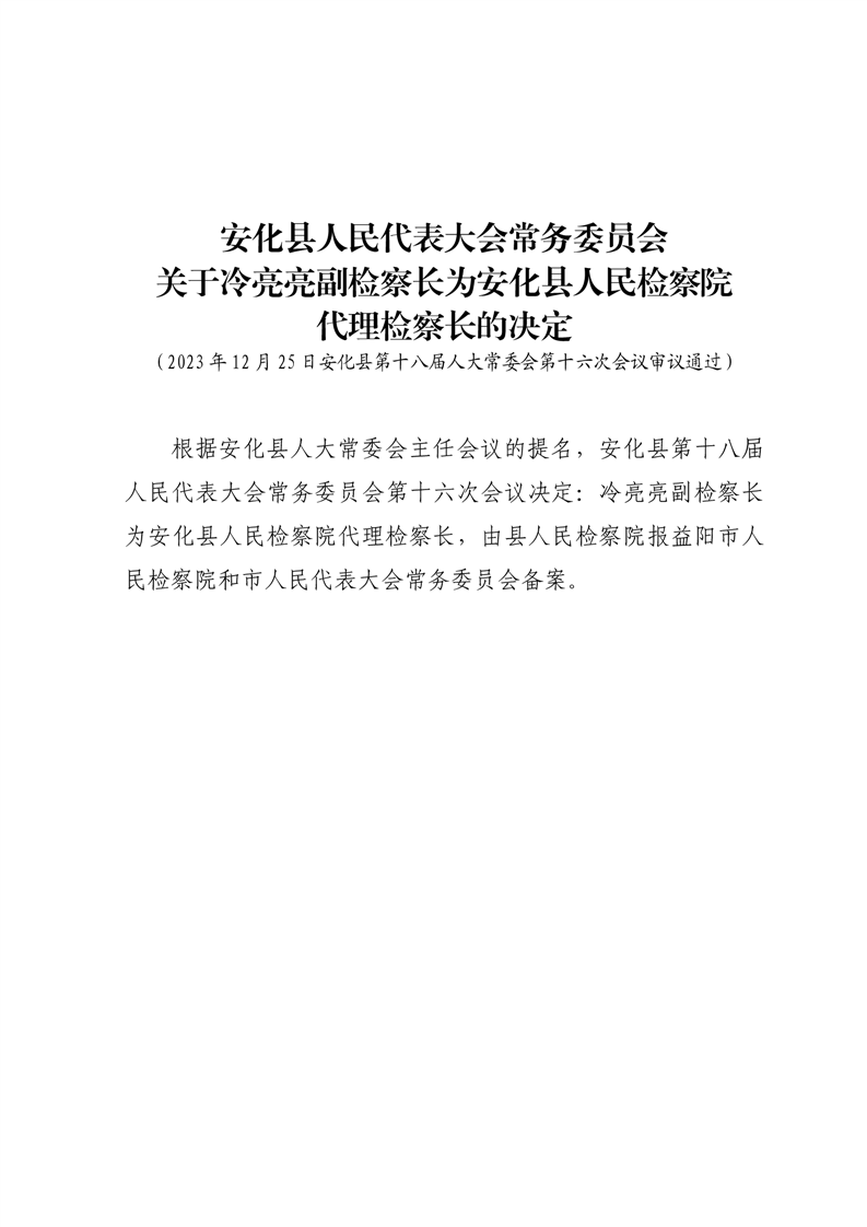 关于冷亮亮副检察长为安化县人民检察院 代理检察长的决定