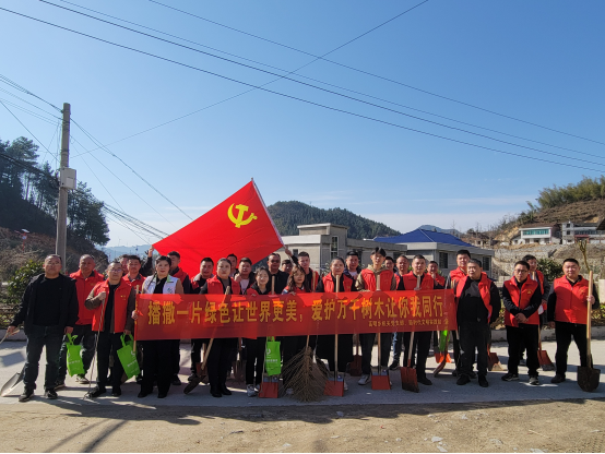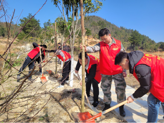 植树现场,只见大家身穿红马甲,分为二三人一组,分工合作,你挥锹铲土,我扶树正苗,个个干劲十足,现场呈现一派热火朝天的劳动景象,绿植和红马甲在阳光下显得分外和谐。经过一个半小时的辛勤劳动,200余株金丝楠木、紫薇树、樟树树苗迎风挺立,焕发出勃勃生机,为春光明媚的三月增添一抹盎然的绿意。