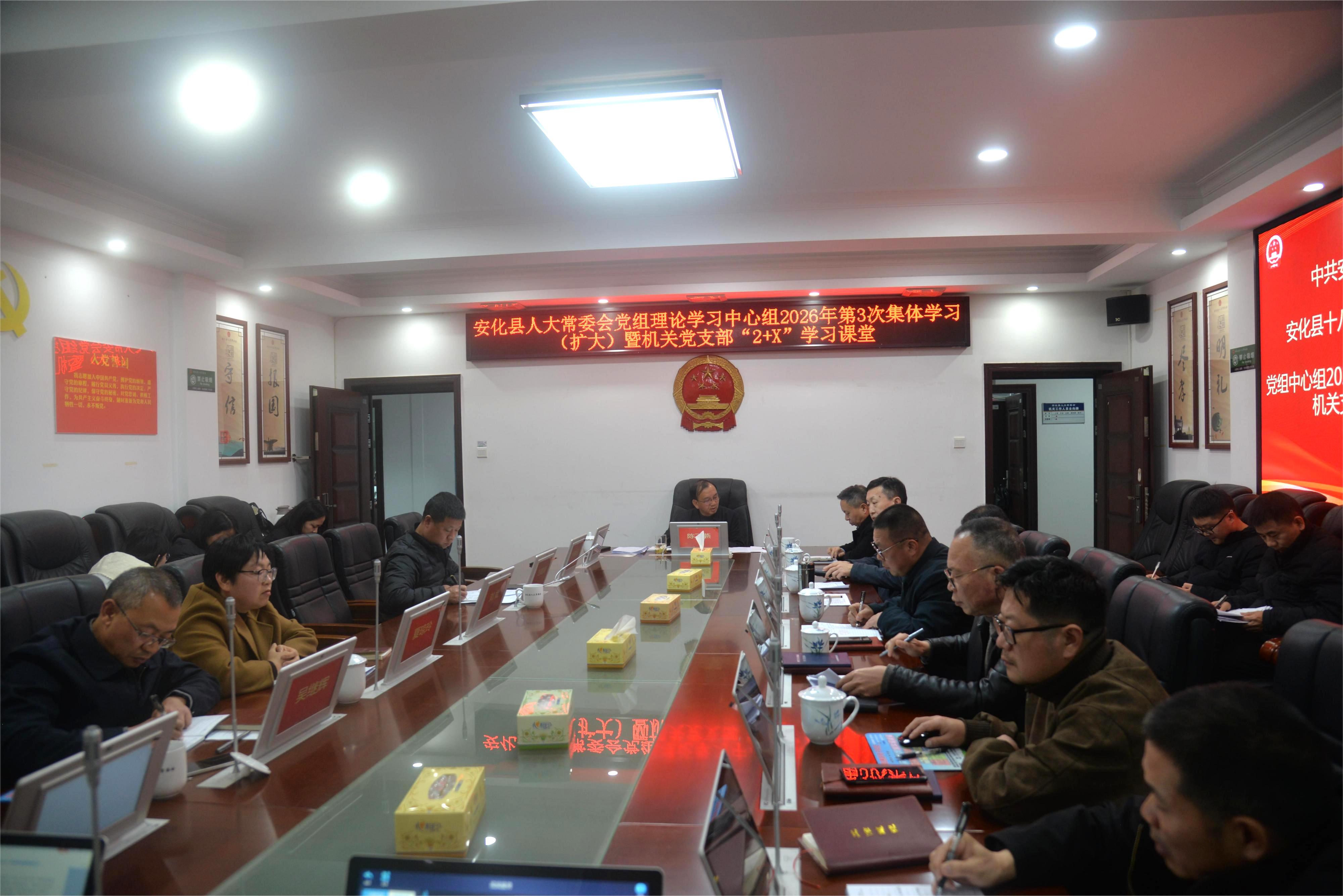 325日,安化县人大常委会党组书记、主任陈飞燕主持开展县人大常委会党组理论学习中心组2026年第3次集体学习(扩大)会议暨机关支部“2+X”学习课堂。县人大常委会副主任龙要平、李艳云、李志生、胡能新参加学习。