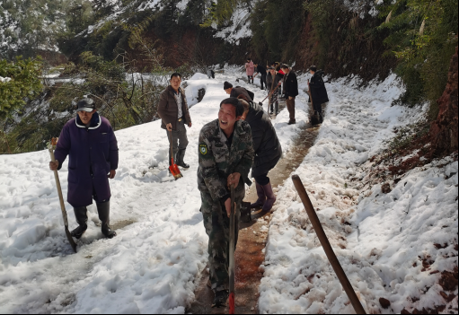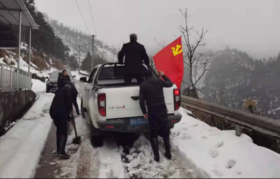 行动分为两组,一组由党支部纪委委员和辅警带队,发动岩屋片区村民由里往外铲除积雪;另一组由田庄乡党委政府干部、村支两委和驻村工作队带着湘中片区村民由外向里推进。在银装素裹的山里,党徽和党旗点缀着这片土地,带动着步行的行人停住脚步纷纷参与进来。 一路上,有不少外来路过的车辆,不明情况上山,导致驶入积雪、陷在雪中、进退两难。党员干部和村民都热心地义务为其清雪,将车移出、劝其返回。司机朋友们一个个喜笑颜开,连声道谢。