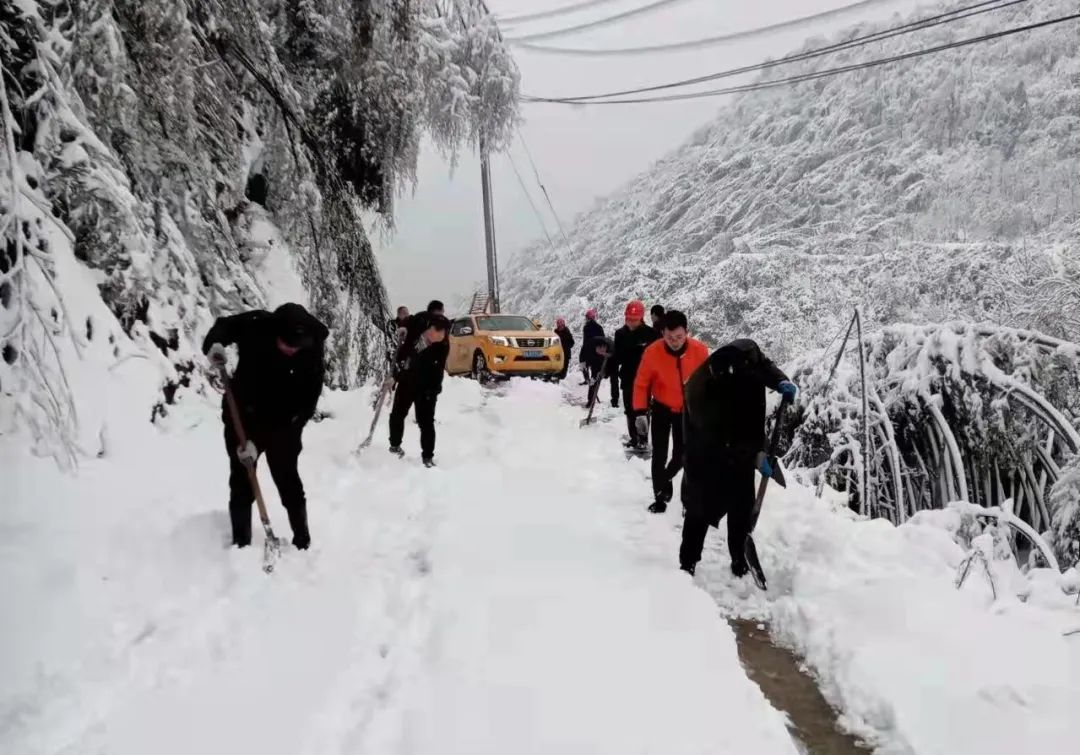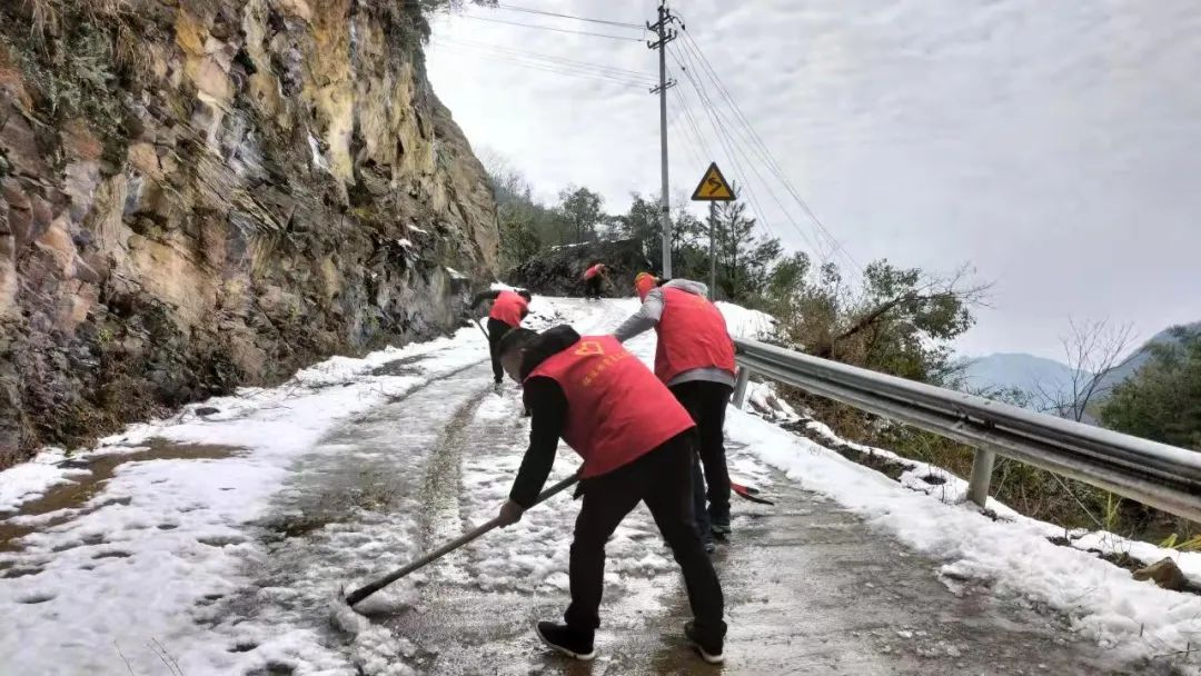 安化县柘溪镇椒园村村支两委和志愿们趁着睛天铲雪。