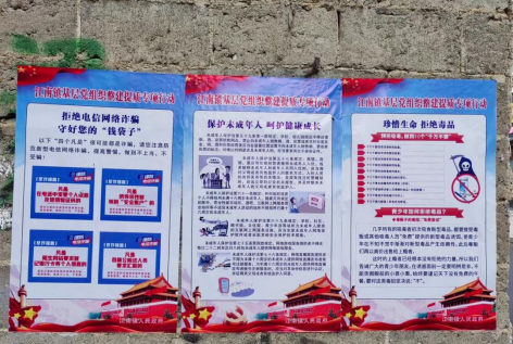 为提升基层党组织整建提质宣传力度,让禁毒防毒、反电诈、保护未成年人、打击非法宗教、打击黑恶势力的观念进一步入眼、入脑、入心,江南镇持续发力,深入推进整建提质工作实效。 屋场话民意