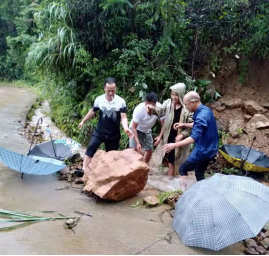 接到镇防汛指挥部紧急电话后,镇村两级干部第一时间赶往现场察看实际情况,果断决策,立即组织人员将邓东梁、邓桥梁、陈勇全3户转移至安全地带。7月3日凌晨5时许,在滂沱大雨中,值守太桥干溪冲地质灾害点的党员干部更是挨家挨户做工作,拍窗户、踹大门,把一户户居民“强行”叫醒,陆续转移了24户居民,共78人次。 共和三组公路塌方道路不通,党员干部、民兵救援队伍撑着雨伞,步行至组里,看到堵塞的地段,把裤脚往上一提,丢掉雨伞,一脚就扎进还在奔流着的泥水之中,用锄头挖开碎石,疏通出一条通畅的道路。处理完这些以后,大家也没有耽搁,立刻赶往下一个受灾点。