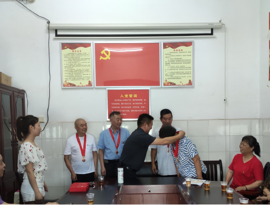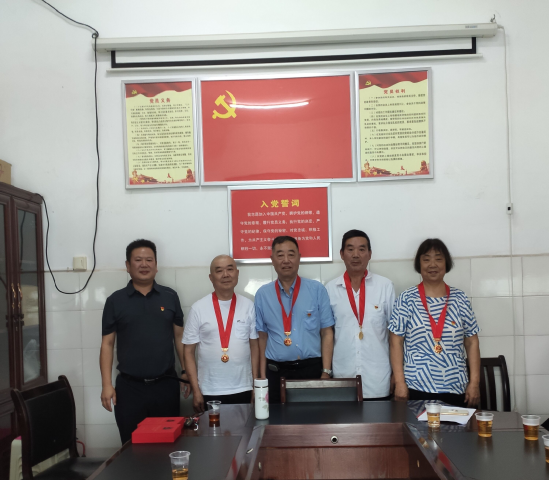 7月5日,县中医医院退休党支部举行“光荣在党50年”纪念章颁发仪式暨党史学习教育推进会。 在支部书记带领下,全体老党员面向党旗,举起右手,重温入党誓词。党委书记欧阳晓云为4名“光荣在党50年”的老党员颁发了纪念章。 老党员代表陈尚书以《喜迎百年华诞 桑榆红心向党》为题为党员们讲述了一堂深动的党课。“我很光荣入党51年,很庆幸我还能看到医院的蒸蒸日上,虽然我已退休,但我的心是永远跟着共产党走的,听党指挥。接下来,借这个党史学习教育的机会,跟大家共同分享我与医院共成长,一生奉献给了中医事业的经历……”。当讲到动情处,陈老几度哽咽,他表示将感党恩、听党话、跟党走,当好党的政策宣传员,为党史学习教育树立标杆。 党委书记欧阳晓云向退休老党员为党的事业、中医事业作出的贡献表示衷心感谢并致以崇高的敬意,希望老党员们继续关心、关注党的建设、医院建设,为党为国为中医事业继续发挥余热。 会上,支部联点领导为1-7月份入党的党员赠送了政治生日贺卡。老党员们互相谈感受,分享学党史心得,激励自己不忘入党初心,坚定跟党走的信念。