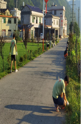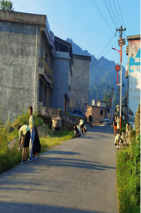 大学生志愿者还利用闲暇时间,助力木孔村委的农村人居环境整治工作,一起弯下腰,不怕苦、不怕累,清除马路两边的杂草。