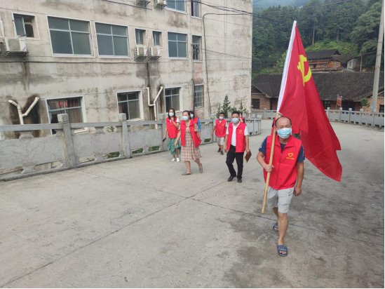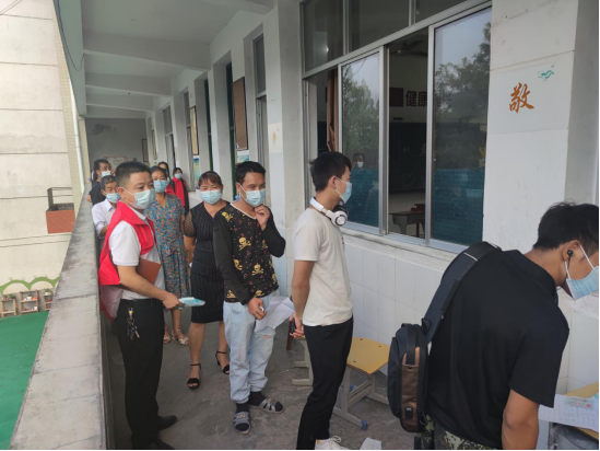 “您好,请您先戴好口罩,没有可到这边领取。同时,请扫这边的二维码出示您的健康码、行程码和同行密接人员自查信息。。。”古楼乡机关党支部一名党员对正在前来接种疫苗的群众做接种准备讲解。 为助力疫苗安全接种,防止出现集中感染,全力构筑全民免疫防线。8月5日上午,古楼乡机关党支部号召机关党员干部,组成一只11人的志愿者队伍,前往古楼乡完小的疫苗临时接种点,协助乡民安全进行疫苗接种。 在接种点,志愿者们戴好口罩,穿好红马甲,教导群众穿戴口罩的正确方式,督促排队群众保持一米间距,落实“三码同查”机制,确保群众安全有序的进行疫苗接种。志愿者们还对疫苗接种留观人员进行知识讲解,宣传劝导广大群众减少不必要出行、出行佩戴口罩、不扎堆聚集。